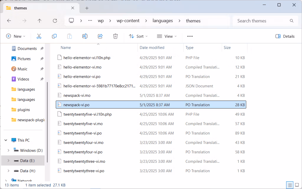 Tiếp theo là truy cập vào thư mục, bạn sẽ nhìn thấy thư mục ngôn ngữ chẳng hạn là lang, languages hoặc locales… và xem thử có tệp tin có phần cuối là -mã-ngôn-ngữ.po (chẳng hạn -vi.po) hay không. Nếu không có thì bạn tiếp tục truy cập vào thư mục ngôn ngữ dùng chung của WordPress là wp-content/languages/themes (đối với theme) và wp-content/languages/plugins (đối với plugin) để kiểm tra.